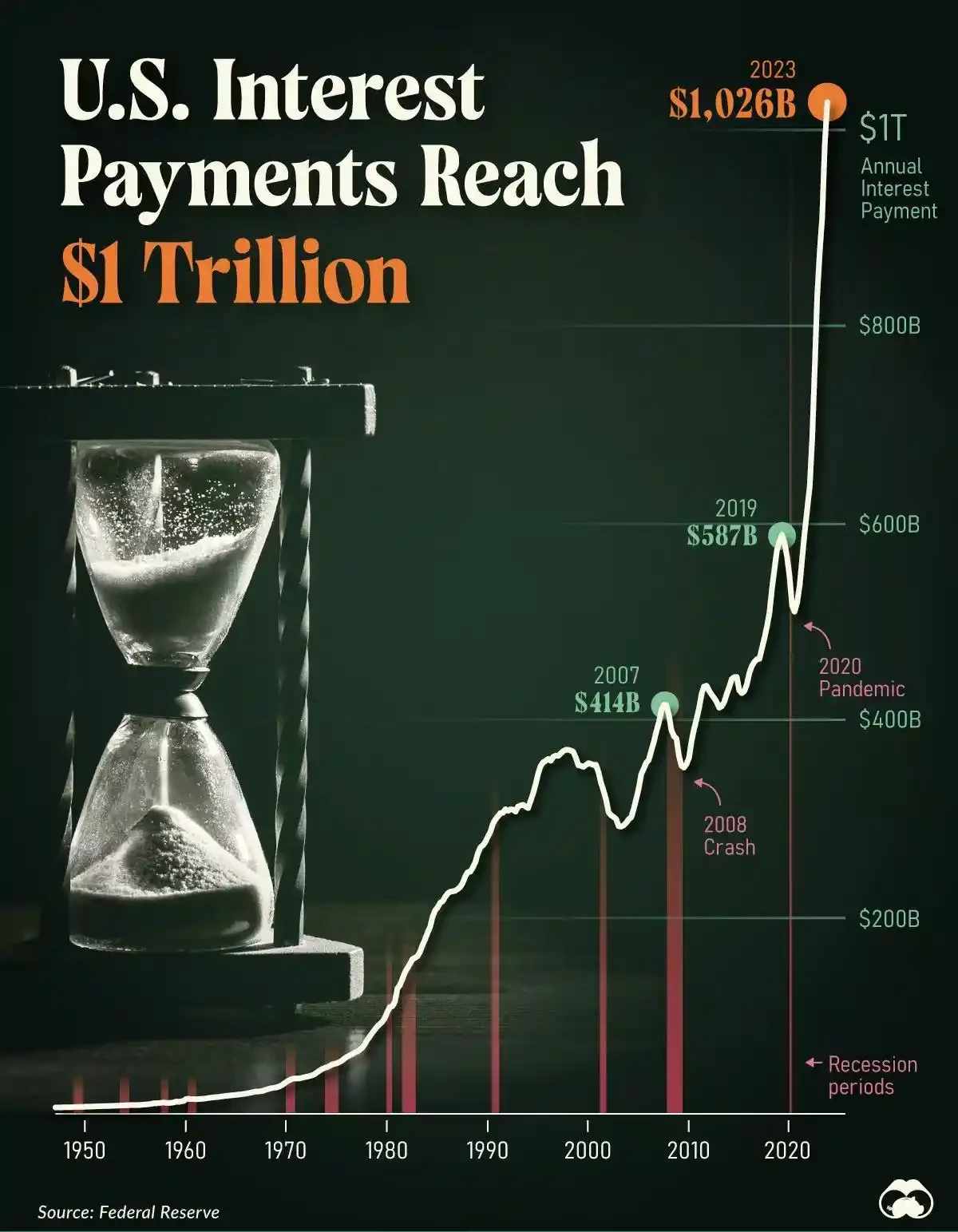 美国国债利息支付总额的历史走势,目前已突破 1 万亿美元