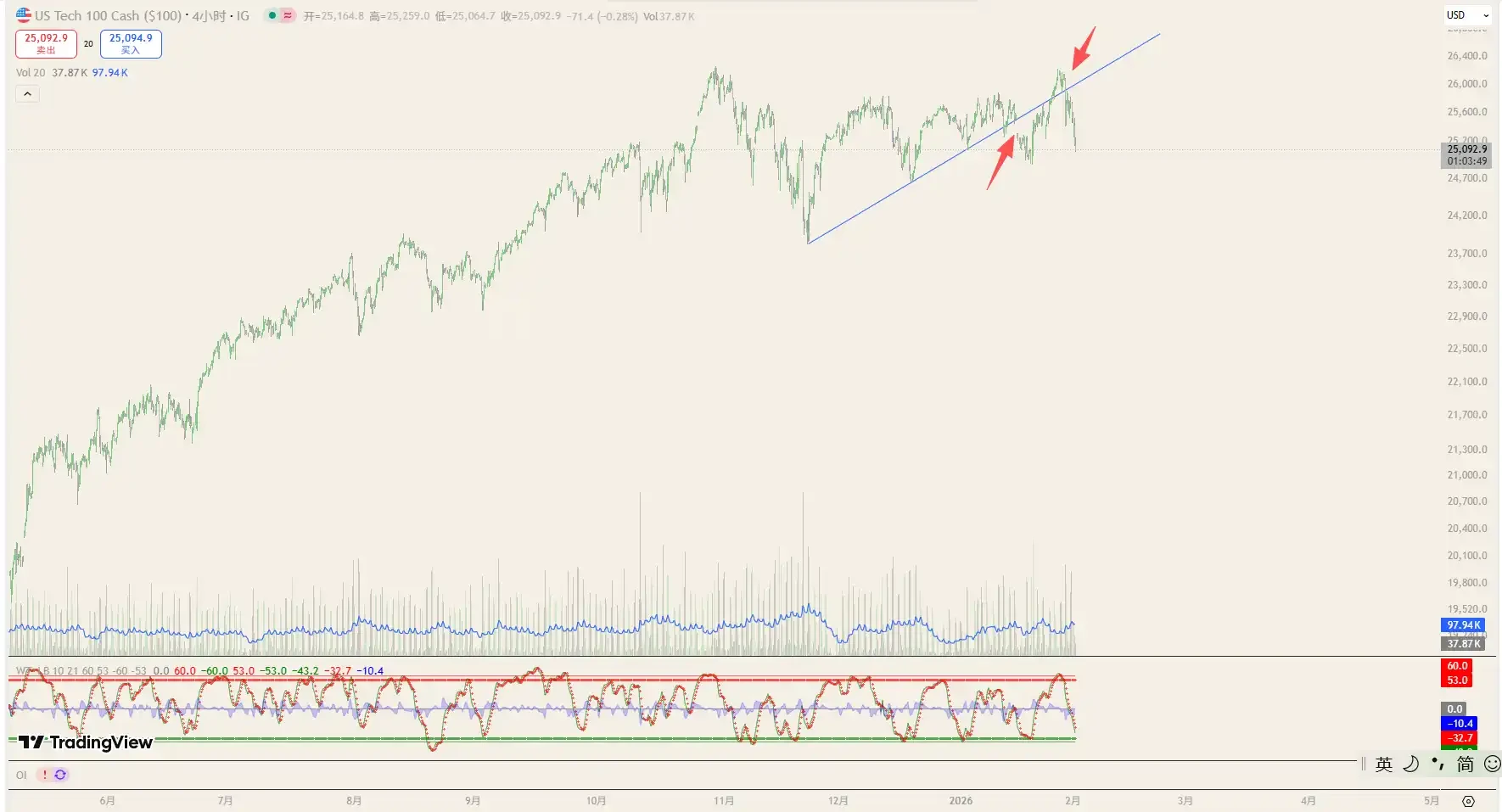 从技术形态上看,纳斯达克指数已在高位震荡长达三个月,形成了一个上升楔形结构。如今,这条关键的上升趋势线被第二次有效跌破,对市场信心构成了较大打击。