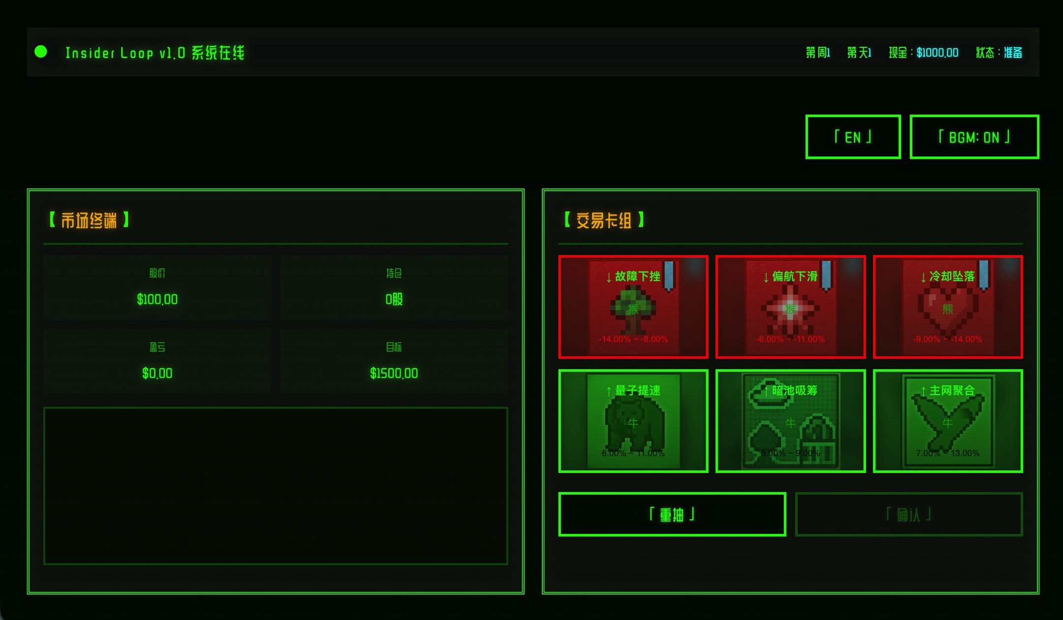 项目介绍:一款融合「小丑牌」机制的肉鸽类卡牌策略小游戏,通过不断组合卡牌效果影响价格走势,在随机性与策略博弈中完成逐周升级的挑战目标。(灵感取自于游戏 Insider Trading)