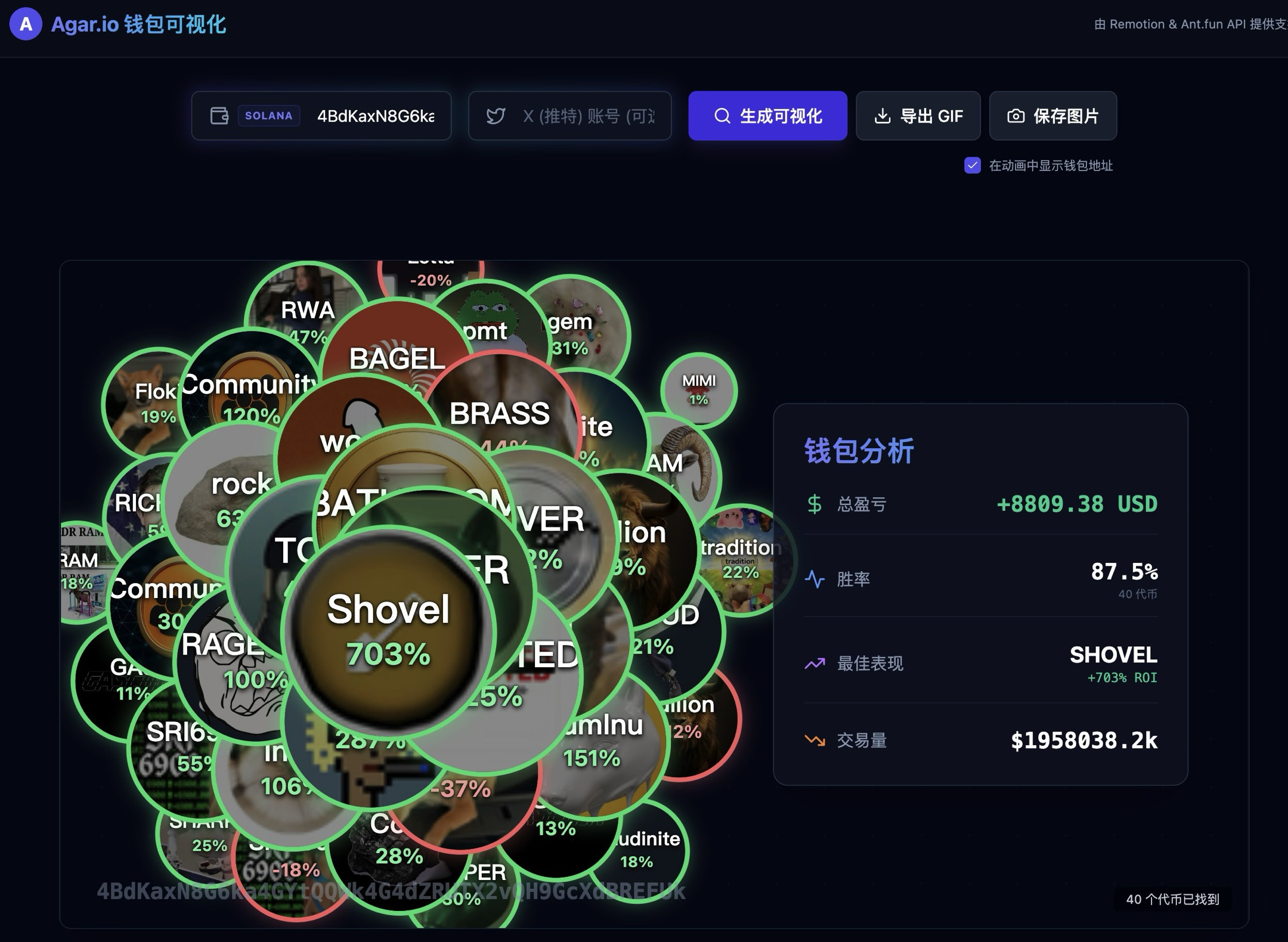 项目介绍:一款将 Solana 钱包数据转化为视频化资产博弈画面的可视化工具,基于 Ant.fun 的链上数据,把持仓与盈亏以 Agar.io 风格动态呈现,让钱包状态一眼可读。