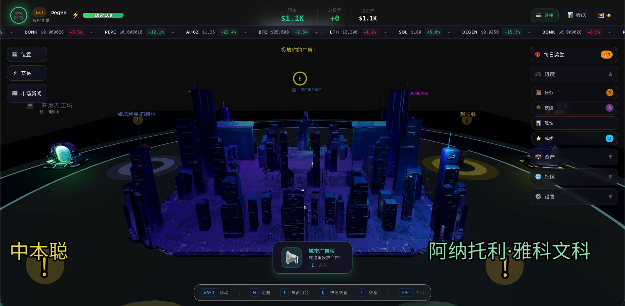 项目介绍:一款沉浸式 3D 币圈人生模拟器,在赛博朋克风格的城市中,用模拟资金完整体验币圈从散户到巨鲸的成长路径,把 FOMO、FUD 与 Rug Pull 等典型情境放进可交互的游戏世界。