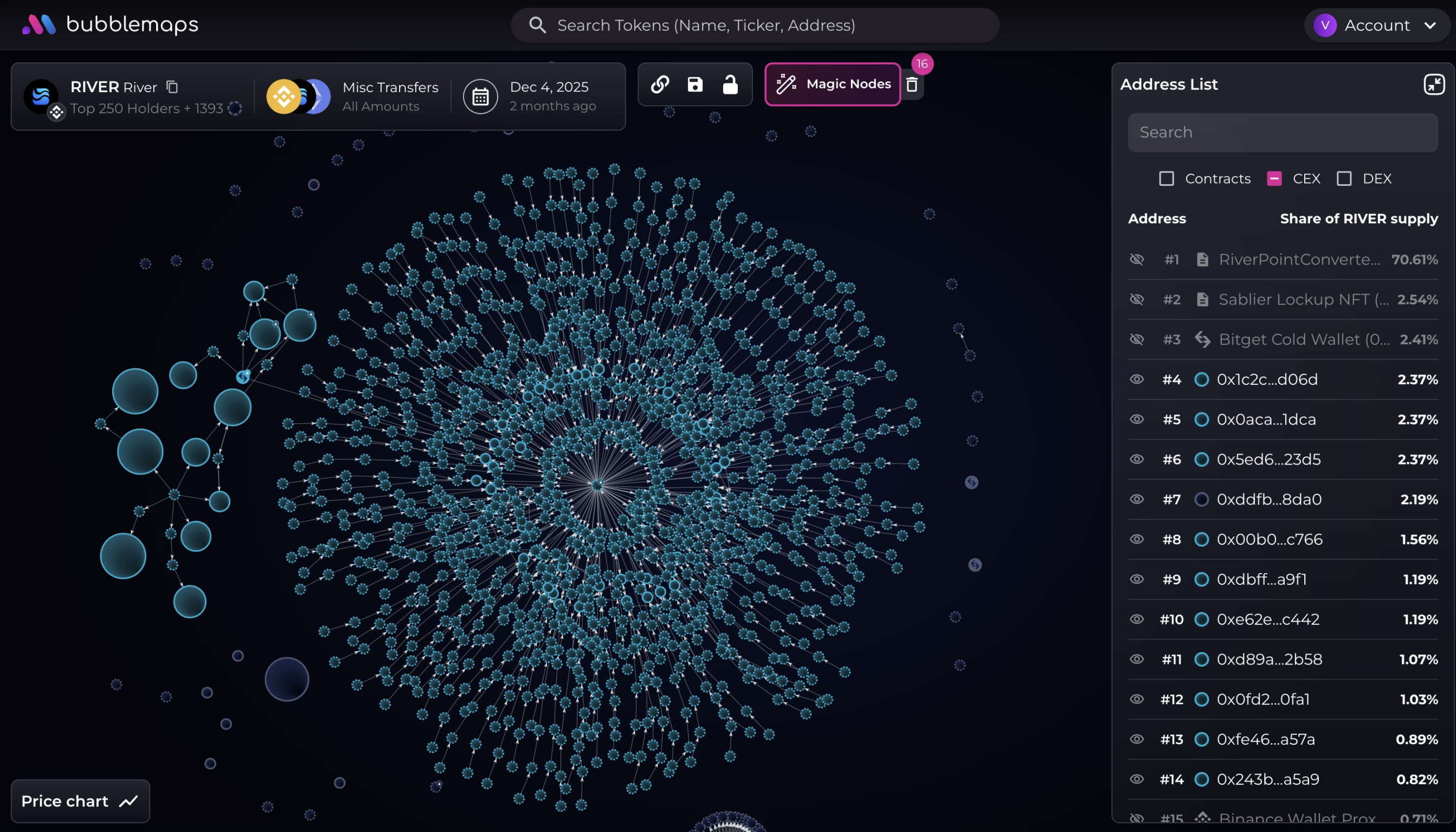 据 Bubblemaps 监测,一个包含 2000 多个钱包地址的巨大集群与 RIVER 直接相关。