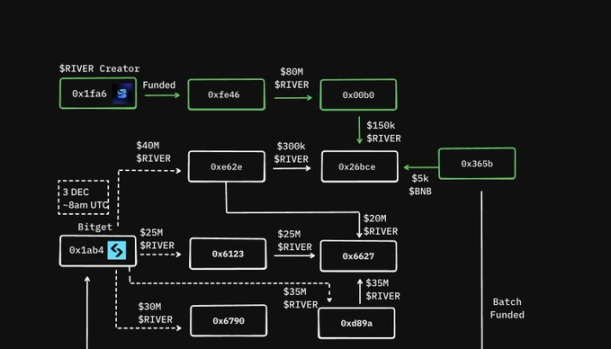 其指出,RIVER 在上线一个月后,有 7 个地址从 Bitget 提取了 2.30 亿枚 RIVER 代币,这些钱包此前没有活动记录,且在 12 月 3 日和 29 日紧密时间窗口内接收了代币。