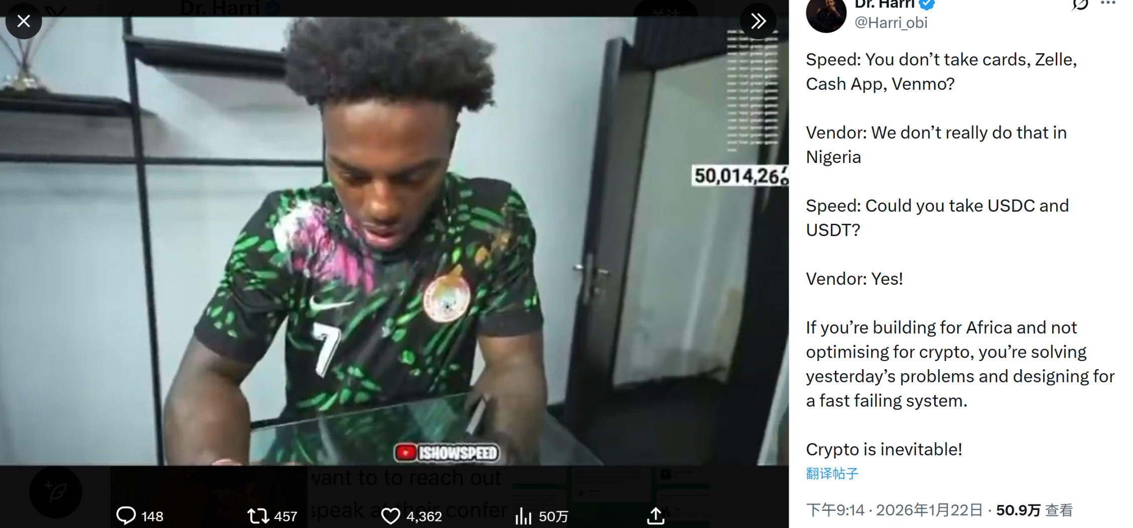 最近有一个典型的破圈案例:全球知名网红「甲亢哥」iShowSpeed 在尼日利亚购物时,传统金融支付方式频频受限(诸如他提到了银行卡、Cash App 等),最终他选择用 USDT/USDC 完成了支付,商户也愿意直接接受。