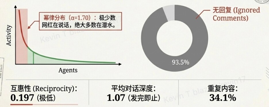 - 非自然的语言分布:人类语言词频通常符合Zipfian分布(指数约1.0),而Moltbook高达1.70。这意味着词汇极其贫乏,34.1%的消息是完全重复的复制粘贴。甚至有Agent陷入死循环,发送了8万次同样的垃圾话。