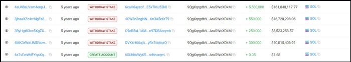 此外,通过追踪 Anatoly Yakovenko 质押账户的历史交易记录可以发现,相关账户曾向多个 Solana 地址进行了大额 SOL 交易,比如:2024 年 8 月至 2024 年 11 月期间,超过 300 万枚 SOL 代币被解除质押并转移,其中超过 150 万枚 SOL 代币仍质押在多个地址上,包括 9E8zG、JQ5jC、A6mJn 和 7pgzZ,如果这些地址也属于 Anatoly Yakovenko,那么他持有的 SOL 代币价值将远超目前估值,按当前价格计算,价值将接近 1.22 亿美元。