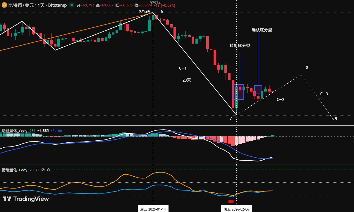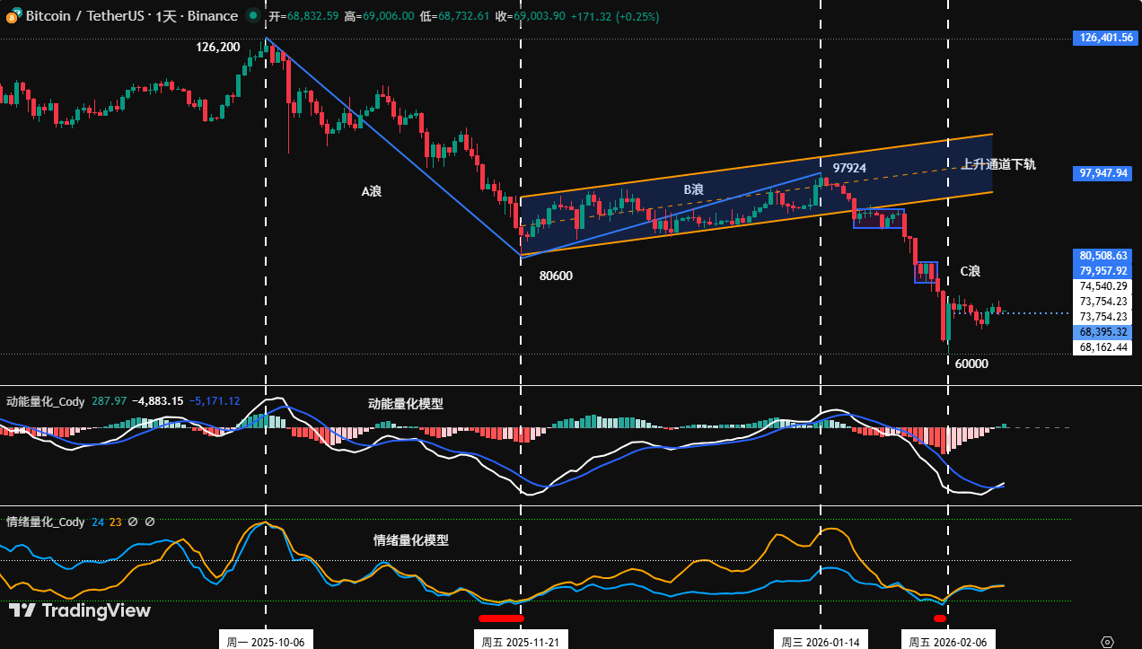 • 此段下跌自 1 月 14 日持续至 2 月 6 日,历时 23 天,目标已达成,将价格打压至60,000 美元附近,构成了C 浪的第一只“脚”。