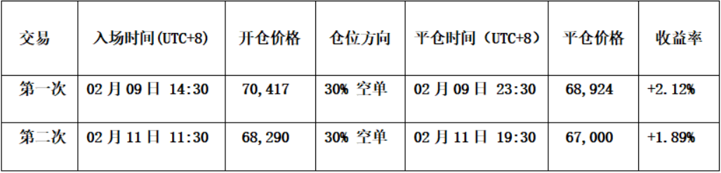• 开仓:币价反弹至72,500 美元压力线附近遇阻,同时价差量化模型触发顶部预警信号(绿点),叠加动能量化模型发出“由多转空”信号,因此于70,417 美元建立 30%空头仓位。