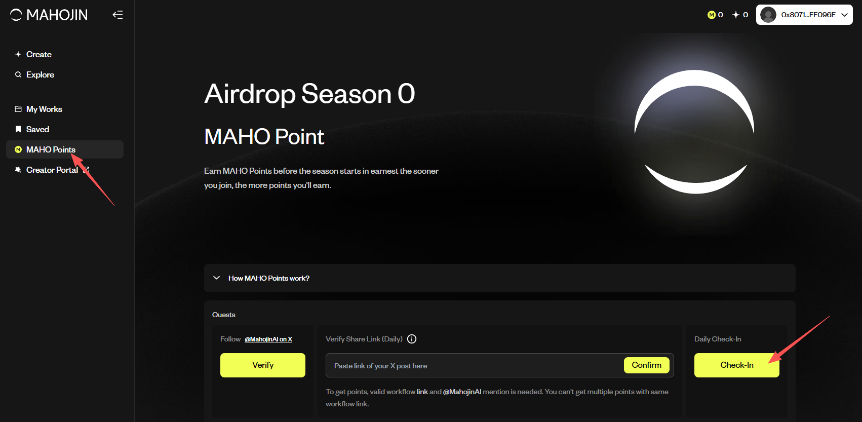 STEP 2. 点击“MAHO Points”后,点击“Check-in”完成每日签到赚积分。