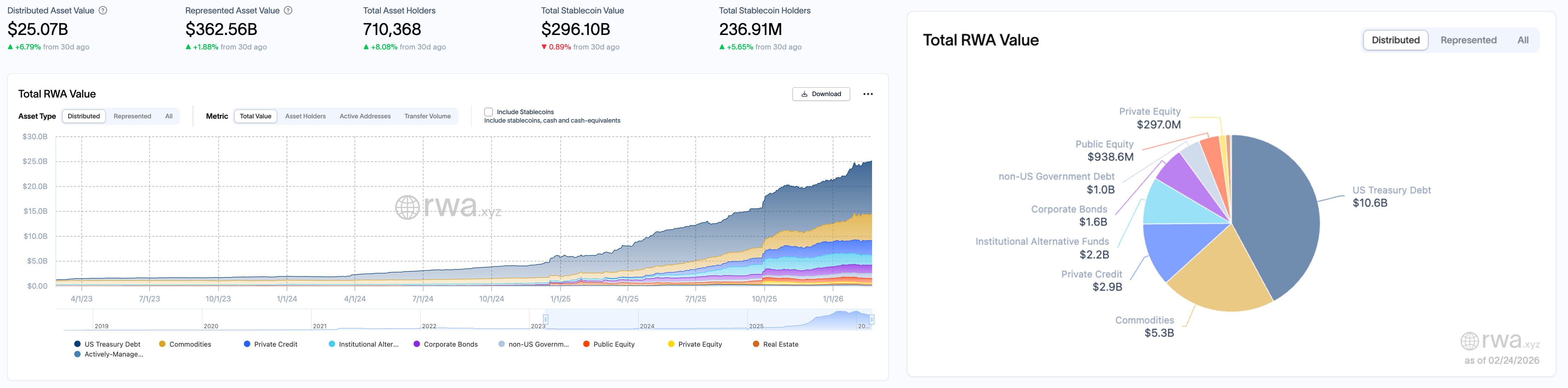 整体来看,相较 2 月 10 日,本阶段 RWA 市场中,链上分布资产规模仍持续性扩张,美债成为主要资金承接方向,商品与私人信贷维持高位稳定,结构性增量更多集中在低风险或高流动性品类。此外,稳定币市值横盘但用户显著增加,且风险偏好整体保持温和,资金并未大规模向高波动或低流动性资产迁移,结构重心仍偏向收益确定性与流动性兼顾的方向。