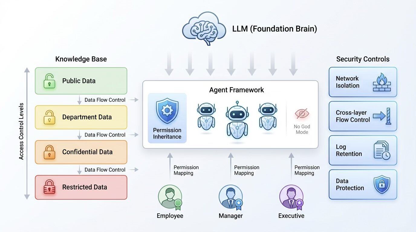 但大模型只是业务的底层“大脑”。真正复杂的,是数据和权限。