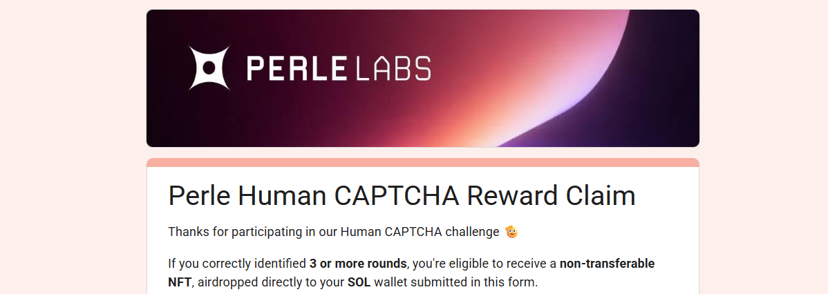 STEP 2. 除完成“Marketplace”中的全部任务外,在 Perle Labs 对应推文内容中回复指定内容后,进入个人 X 平台回复页面并核对答案,需要答对至少 3 次并截图上传 (确保每张截图中清晰显示 X 用户名、回复日期以及答案)(表格链接:https://docs.google.com/forms/d/e/1FAIpQLSd7m8YgMSf8TxeC7TqJ8SzBIbZosXKWpyEsjbrKTH5pW3UGLQ/viewform?pli=1),NFT 将会空投到表单中提交的 Solana 网络地址,提交窗口将于 3 月 8 日关闭。