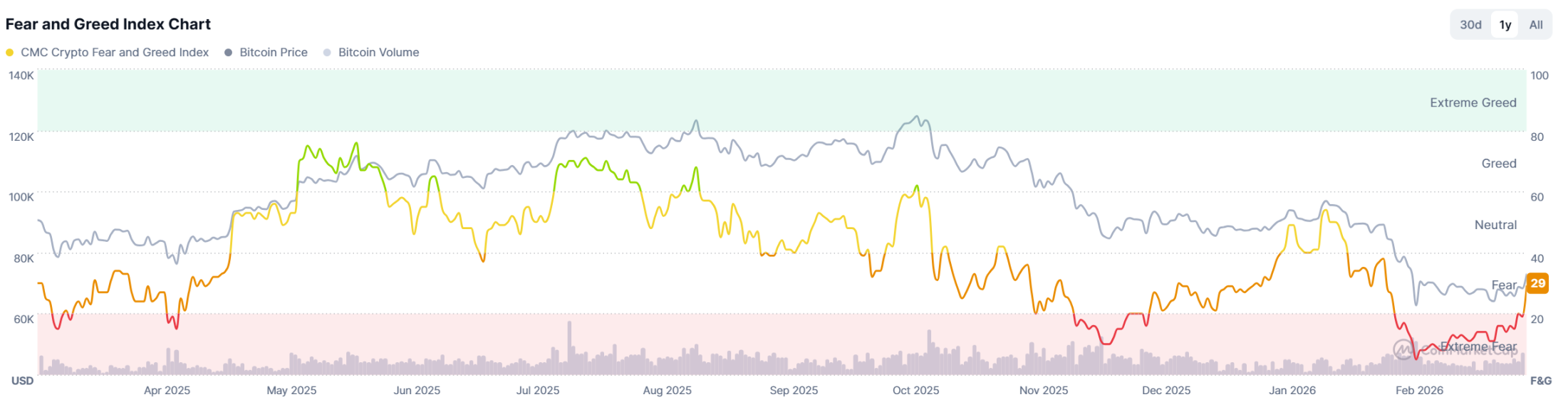 爆仓数据方面,据 coinglass 显示,全网未平仓合约过去 24 小时爆仓 5.95 亿美元,空单爆仓 4.82 亿美元。市场恐慌指数也终于摆脱极度恐惧区间范围,回升至 29。