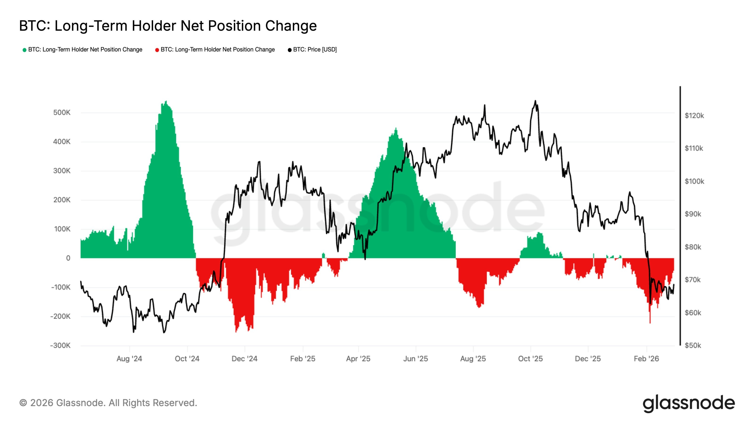除此之外,3 月 3 日的数据图显示,经过数月持续的净卖出后,长期持有者(LTH,Long-Term Holders)的净头寸变化如今正趋于缓和。