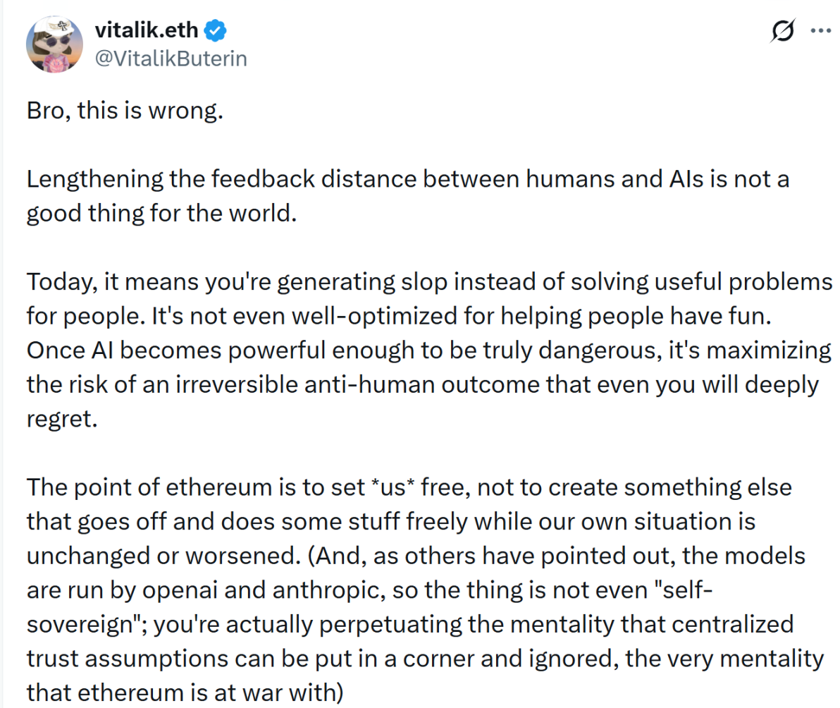 但这一设想也迅速引发争议,Vitalik Buterin 就对这一方向提出了明确质疑,将这一方向评价为「错误」,并认为问题的核心在于「人类与 AI 之间的反馈距离被拉长」,直言如果 AI 的运行周期越来越长,而人类干预越来越少,那么系统很可能会逐渐优化出人类并不真正想要的结果。