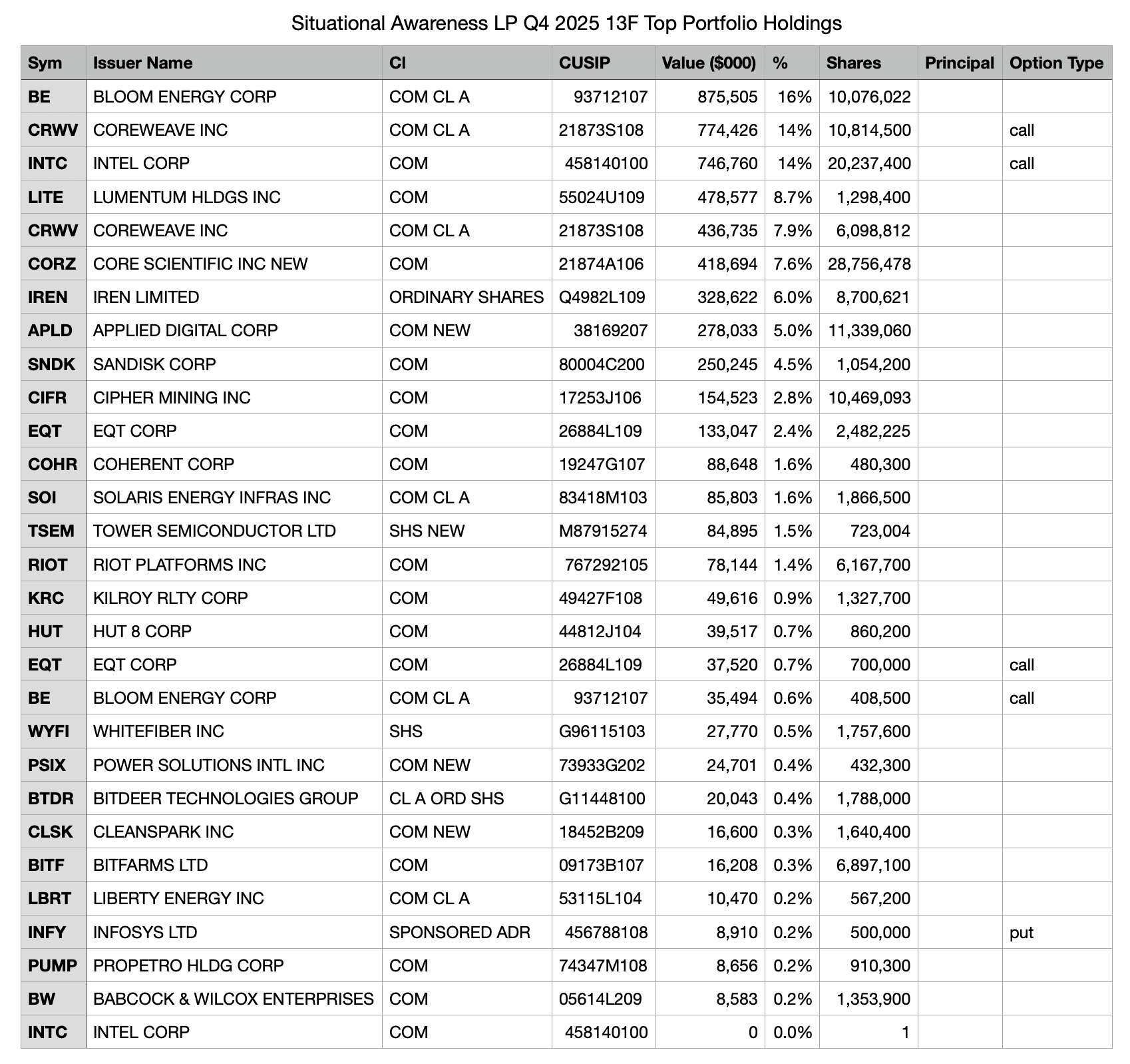 • Situational Awareness LP 的前十大持仓占比高达 86%,策略上高度集中,主要布局能源、算力、光通信和存储等领域。