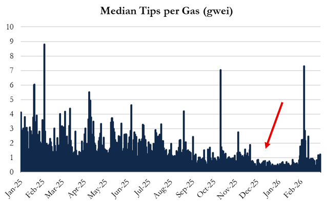 此外,gas limit 的提升还打击了以太坊的验证者(validators)群体,验证者现在每单位 gas 获得的小费收入下降了 40%–50%。收益率下降将削弱质押需求以及高价值的交易活动,从而进一步削弱机构采用。这一飞轮现在已经开始反向运转。