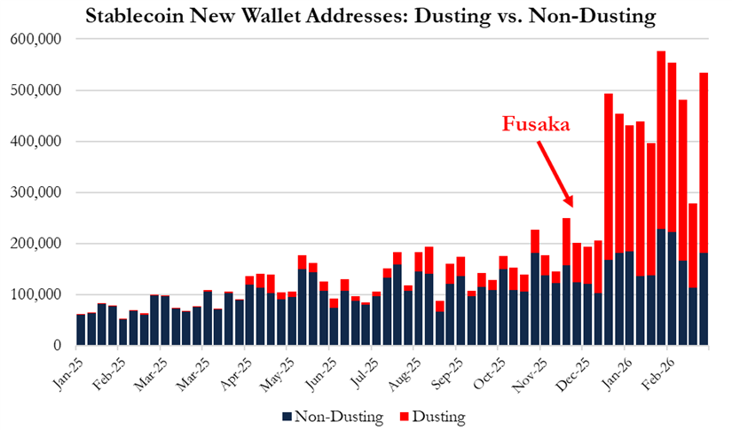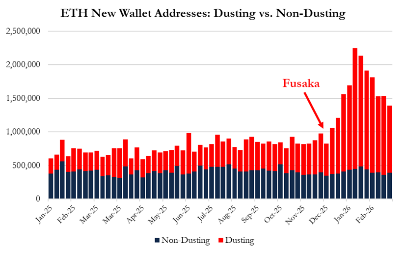 我们对 2025 年 1 月至 2026 年 2 月的链上数据进行了全面分析,结果显示 Lee 所称的“机构采用带来了以太坊的活动增长”,实际上可以用大量低价值的地址投毒(address poisoning)与粉尘攻击(wallet dusting)行为来解释。这些行为是 Fusaka 升级后区块空间过剩所引发的。