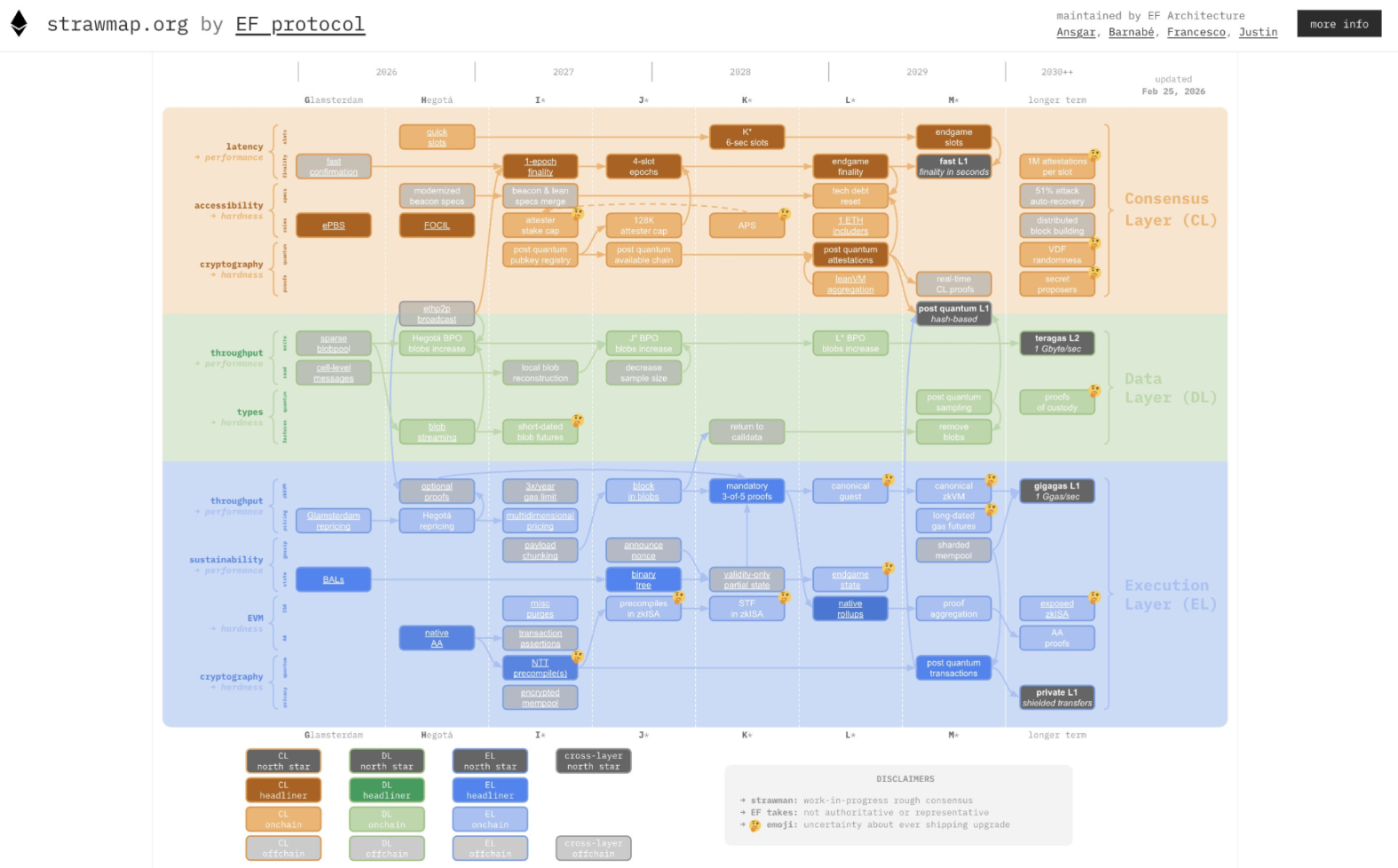 Strawmap 的发布,恰逢市场对 ETH 价格表现心存疑虑之时,从这个角度看,这份路线图最重要的价值,正在于将以太坊重新定义为「基础设施」。