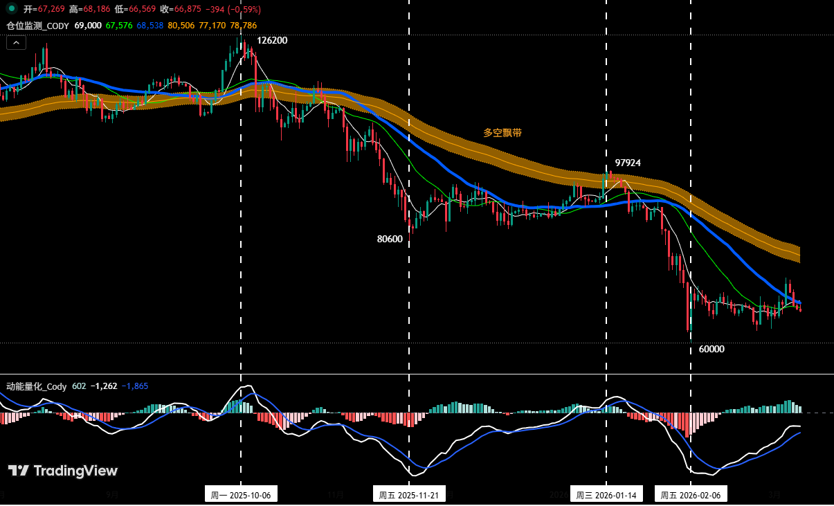 • 开仓:当币价有效跌破中枢下轨66,250 美元后,然后回抽该点位但无法站稳时,并结合模型顶部信号,可顺势建立30%空头仓位。