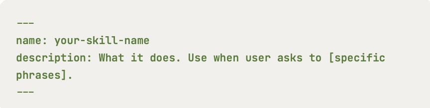 在文件的最开头,通常是被两段短横线 --- 包起来的区域。这里面只写两个核心属性:name 和 description。