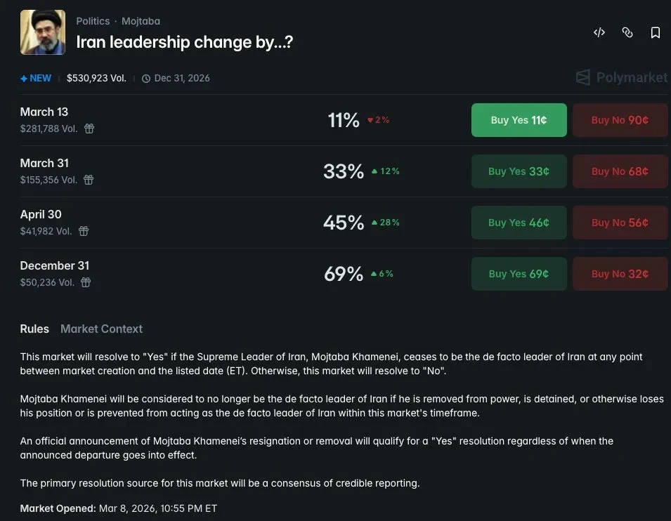 “伊朗领导层是否会在指定日期前发生更迭?” 这一市场于 3 月 8 日晚间开盘,总交易量已逾 53 万美元。市场数据显示,交易者对莫杰塔巴短期内被“移除权利中心的位置”的概率判断差异显著:以 3 月 13 日为节点,“Yes”概率仅为 11%;以 3 月 31 日为节点,概率升至 33%;而以 4 月 30 日为节点,概率已达 45%;若将时间线拉长至年底(12 月 31 日),则“Yes”概率高达 69%。这意味着,超过三分之二的市场参与者认为,莫杰塔巴在 2026 年内无法以实际掌权者身份走到年末。