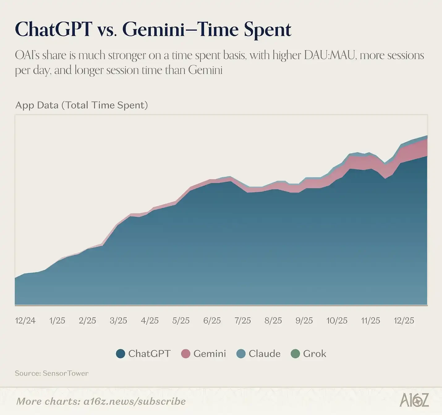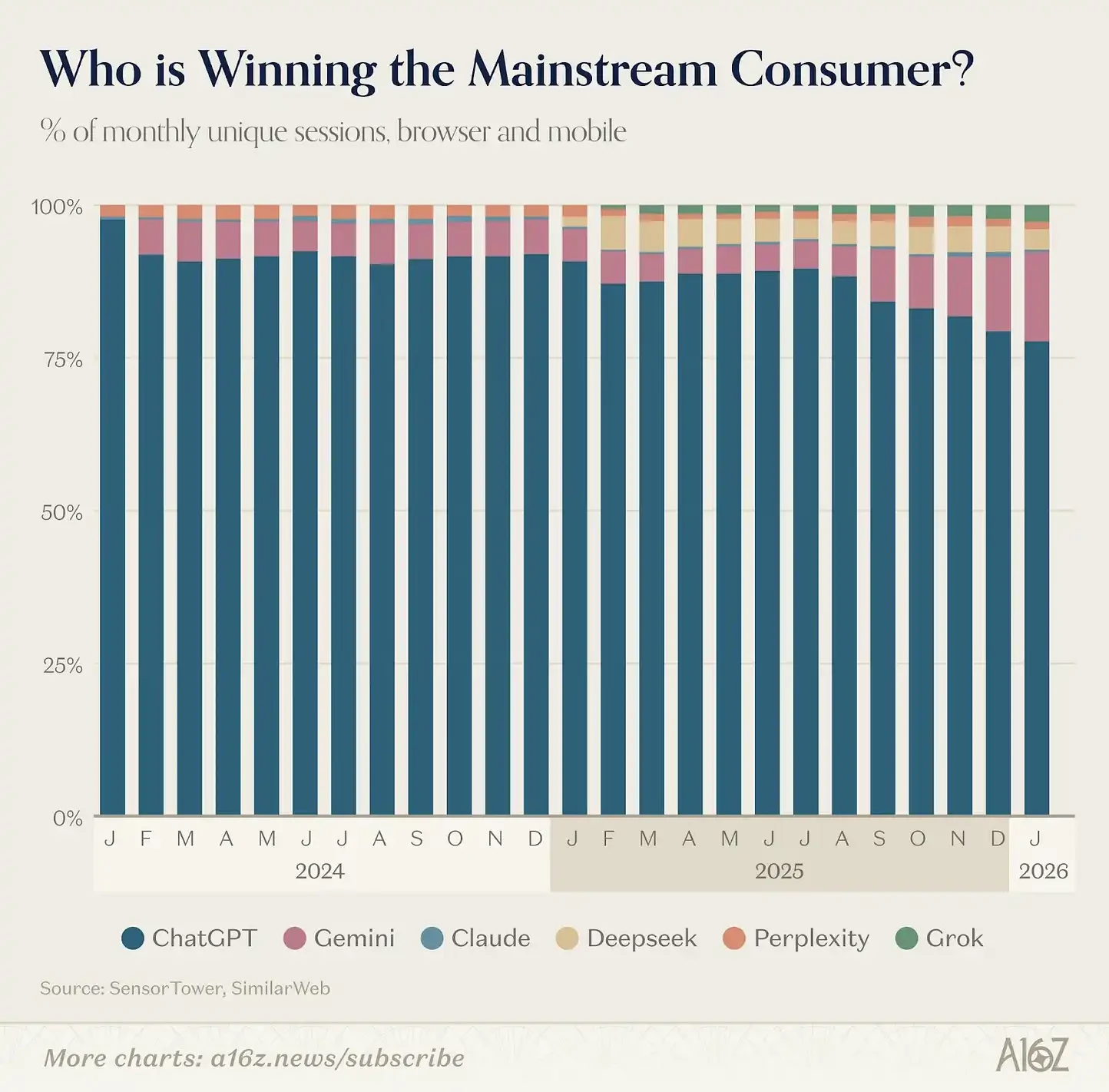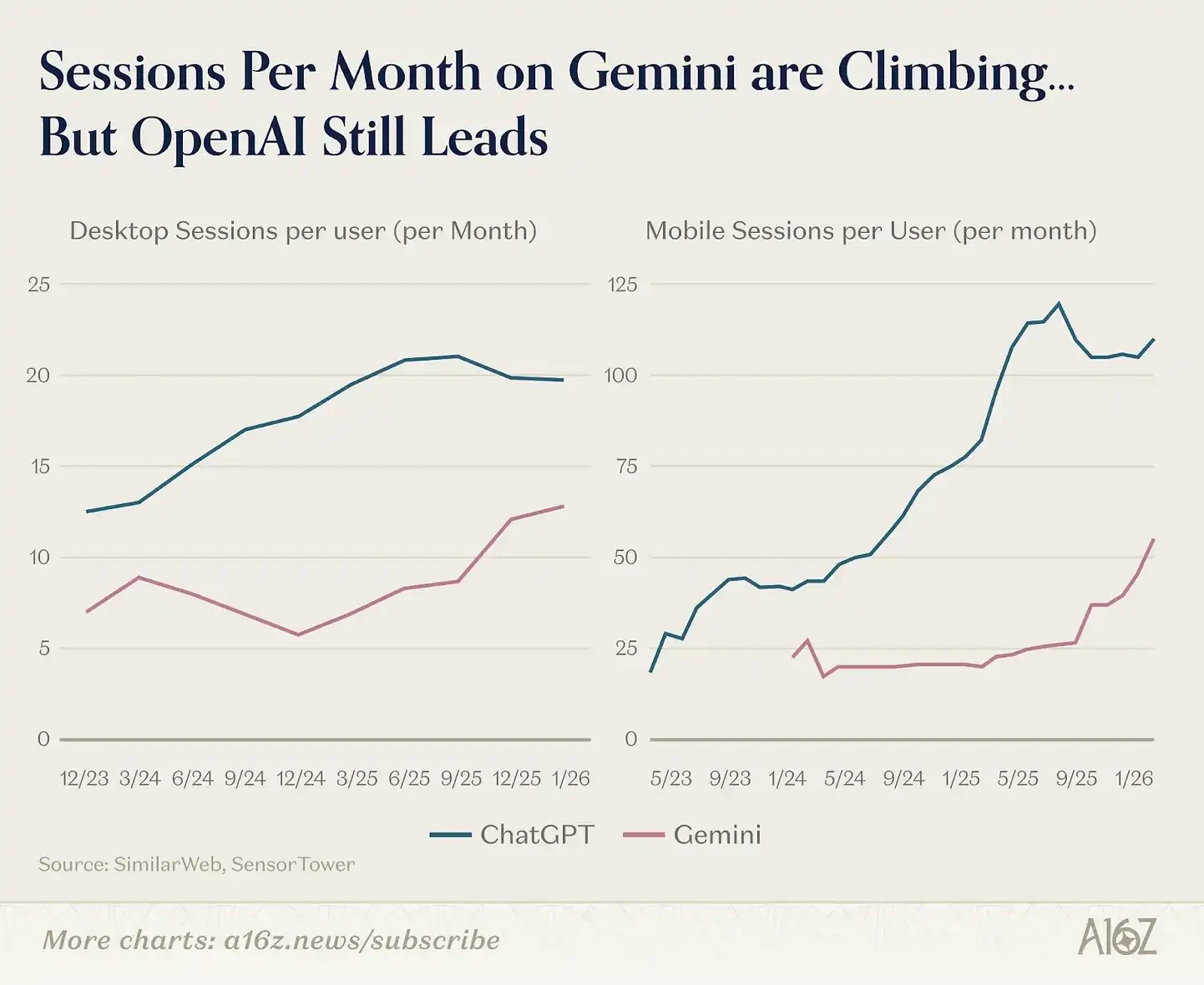 根据 Yipit Data 的数据,截至 2026 年 1 月,Claude 的付费订阅用户同比增长超过 200%,而 Gemini 的增长率则达到 258%。与此同时,我们也观察到越来越明显的多平台使用行为:大约 20% 的 ChatGPT 网页端周活用户,在同一周内也会使用 Gemini。