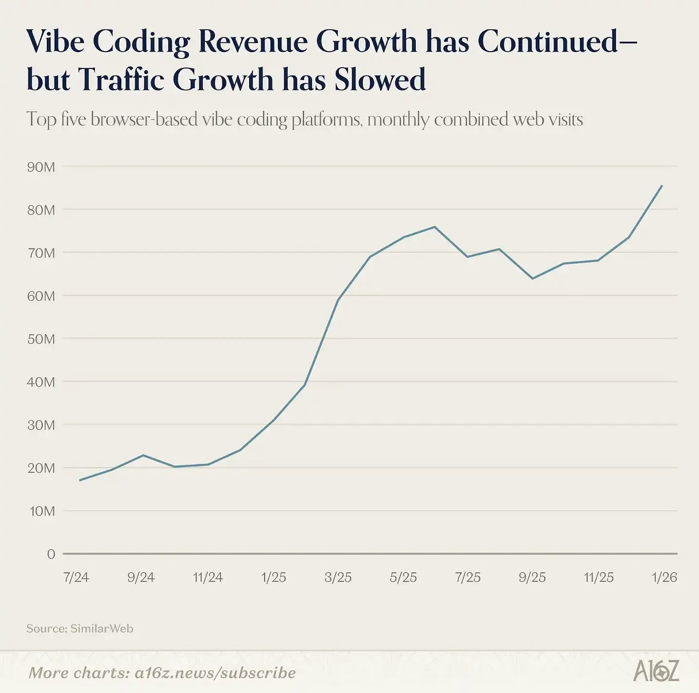 事实证明,vibe coding 在技术用户(以及部分半技术用户)中具有很强的留存能力。本期榜单中,Replit 和 Lovable 仍然在列,同时 Claude Code(通过 Claude)也进入榜单。未来仍然存在更多增长空间,因为这一趋势尚未真正触及大众市场。目前,排名前五的 vibe coding 平台总体流量仍在增长,尽管相比最初的爆发期已经有所放缓——但随着开发者和团队更深度地使用这些工具,许多产品的收入仍在持续上升。
