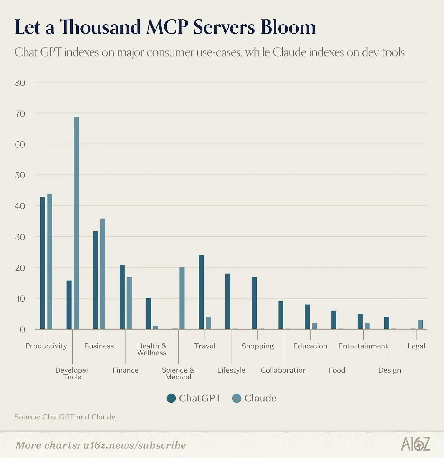 应用目录已经反映出这种方向。截至 2 月底,ChatGPT 的应用商店已有 220 个应用,覆盖 13 个类别;Claude 则拥有 约 160 个官方精选连接器,以及 约 50 个社区构建的 MCP 服务器。但两者仅有 41 个应用是重合的,约占两者总目录的 11%。而这 41 个几乎全部是通用的生产力工具:Slack、Notion、Figma、Gmail、Google Calendar、HubSpot、Stripe 等。