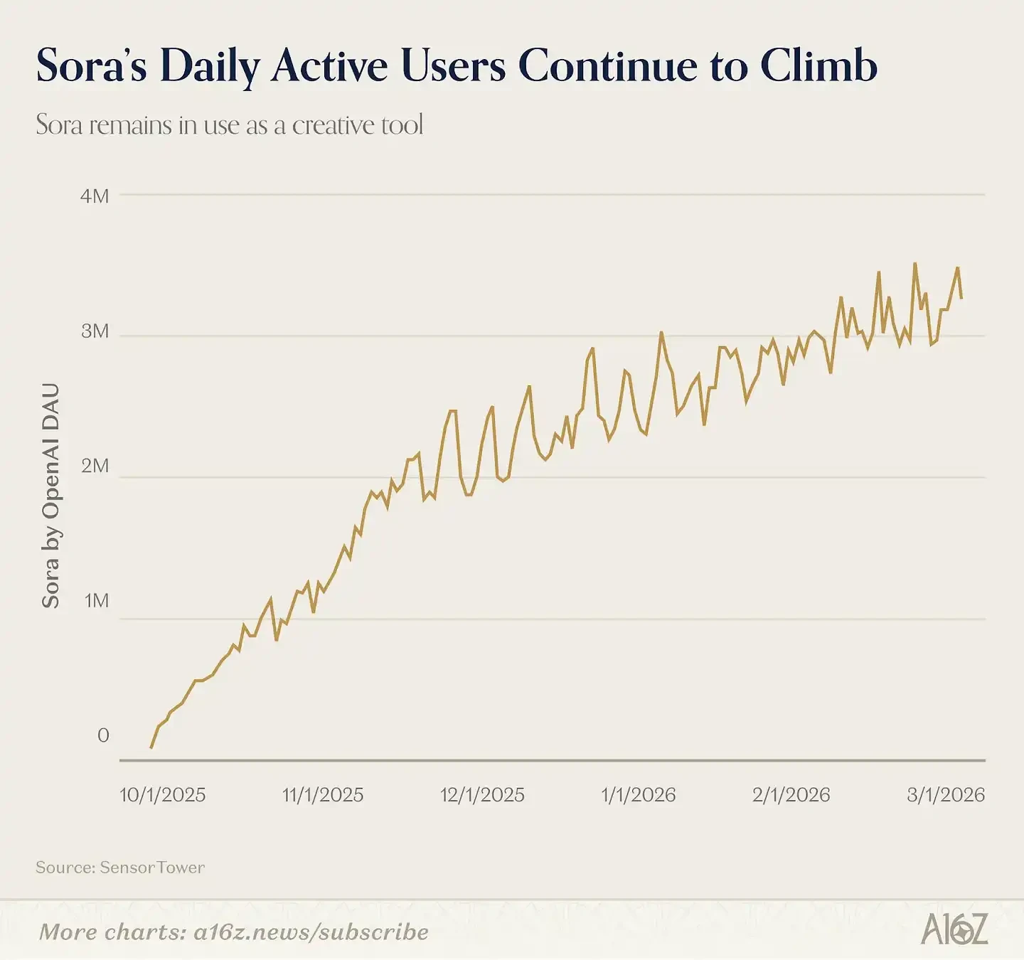 那缺席的是谁?Sora。OpenAI 在 2025 年 9 月 将其旗舰视频模型 Sora 2.0 以独立应用形式推出,用户可以上传自己的数字形象(Cameo),生成包含真实人物的视频。Sora 曾连续 20 天登上美国 App Store 榜首,并且比 ChatGPT 更快达到 100 万下载量。但此后下载量逐渐回落,因为 Sora 并没有发展成一个病毒式传播的社交应用(至今仍没有人真正破解「AI × 社交」的组合),因此未能进入本期的移动端榜单。不过,根据 Sensor Tower 的数据,移动端 Sora 的日活用户仍超过 300 万。许多 AI 视频创作者依然在使用该模型,只是生成的内容往往会发布到其他平台。