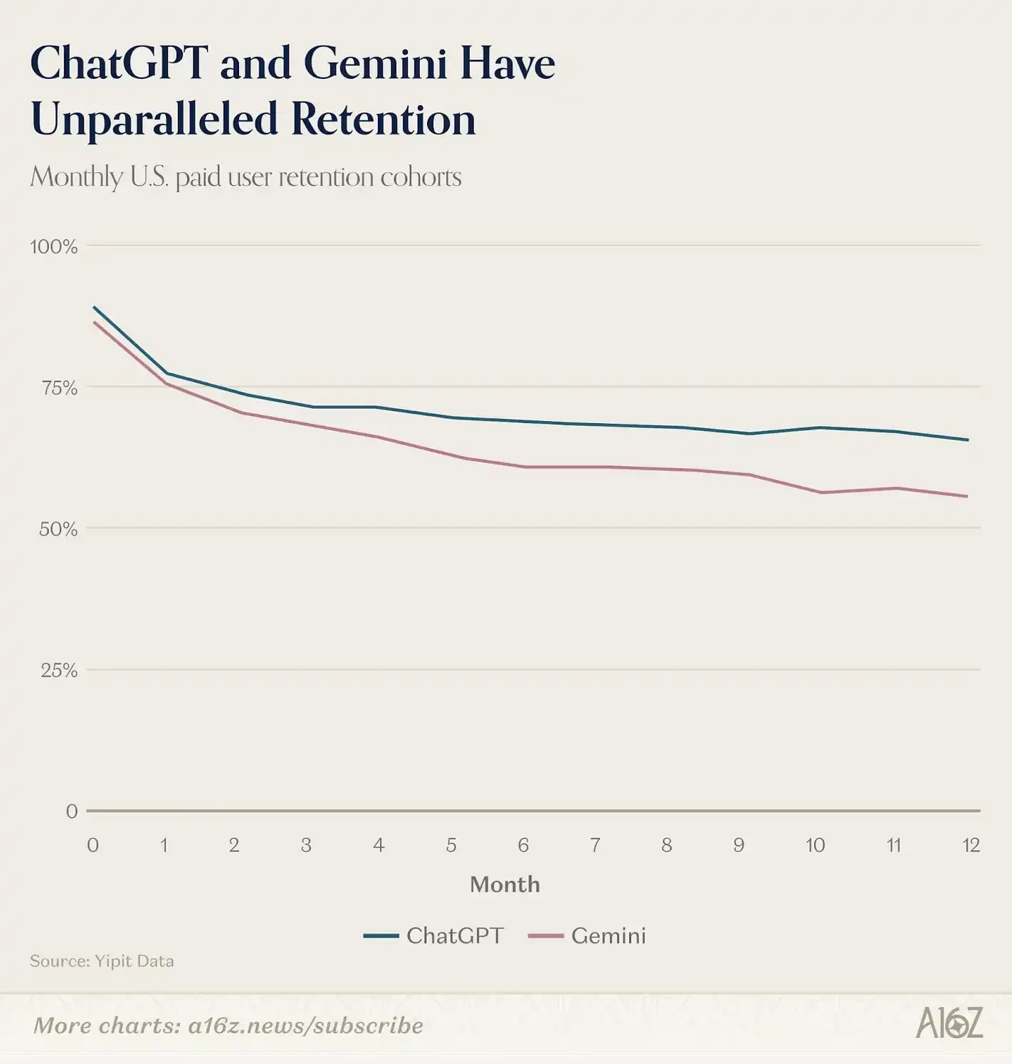 初步数据显示,Gemini 在网页端的用户月均会话次数正在上升,不过仍然比 ChatGPT 低约 1.3 倍;而在移动端,ChatGPT 的优势更为明显,用户月均会话次数 高出 2.2 倍。根据 Yipit Data 的统计,两家公司在美国市场的消费级付费订阅用户留存率都处于行业领先水平。