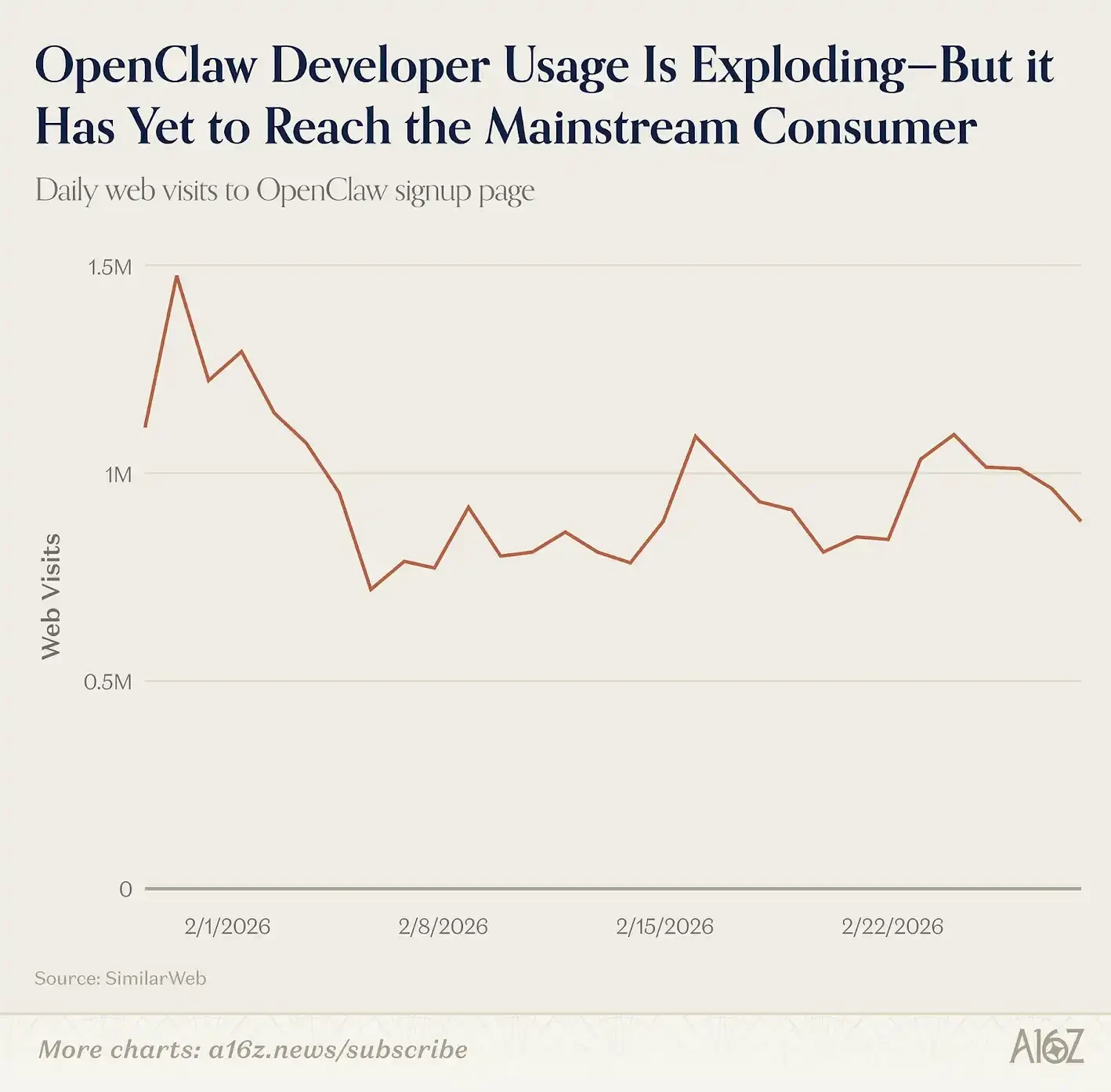 不过,OpenClaw 目前还不是面向普通消费者的产品,安装和维护仍然需要一定的 Terminal(命令行)操作知识。尽管如此,它在技术用户中的关注度仍在持续上升,并在 3 月初成为 GitHub 上 Star 数最多的项目,甚至超过了 React 和 Linux。但从访问其安装网站的新用户数量来看,该产品尚未真正进入大众市场,相关流量仍然相对平稳。