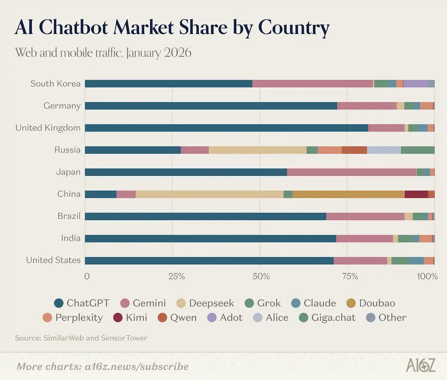 DeepSeek 是目前唯一一个在这两大阵营之间形成「桥梁」的产品。其网页端流量分布为:中国 33.5%、俄罗斯 7.1%、美国 6.6%,移动端的结构也呈现类似格局。与此同时,中国用户还大量使用字节跳动的豆包(Doubao)以及本土模型 Kimi。