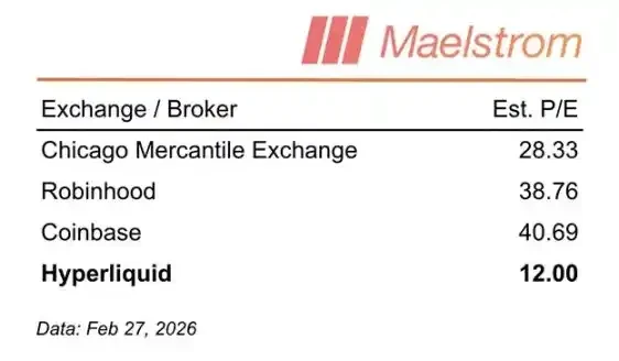 为了确定合理的估值水平,我参考了全球顶级交易平台芝加哥商品交易平台(CME)、主打年轻激进投资者的新型券商 Robinhood,以及受美国监管影响较深的加密交易平台 Coinbase 的当前市盈率。这些机构的市盈率区间很宽,大致在 26~40 倍之间。相比之下,$HYPE 仅 12 倍市盈率,明显被严重低估。