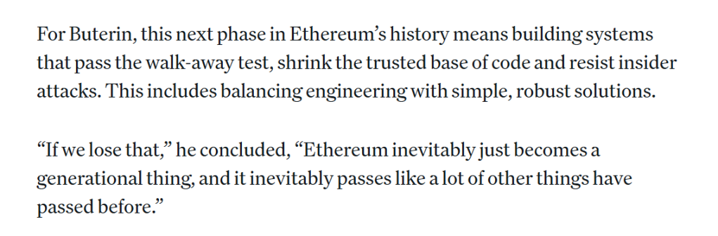 这无疑会让人联想到 Vitalik 此前常提及的另一个检验以太坊长期价值的标准,即 walkaway test(退出测试),这个测试问的是一个非常朴素的问题,如果以太坊的所有核心开发者明天集体消失,协议还能正常运转吗?