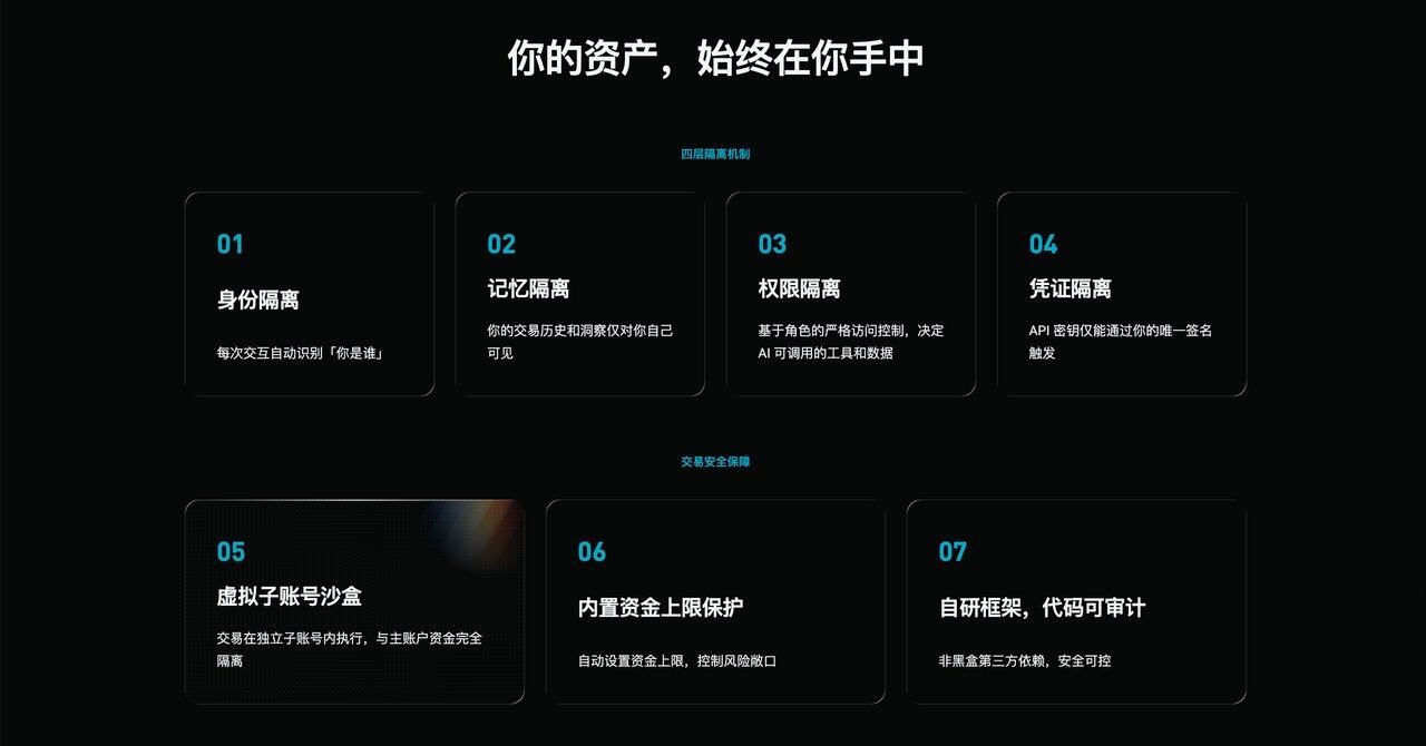 在安全方面,GetClaw从设计之初就将用户资产保护作为核心原则。系统采用四层隔离安全机制,通过身份、记忆、权限与凭证的多层防护,确保用户数据与账户资产始终处于可控状态。在交易功能开放后,系统还将引入虚拟子账号沙盒机制与资金上限保护,使所有交易都在独立、安全、可控的环境中执行。