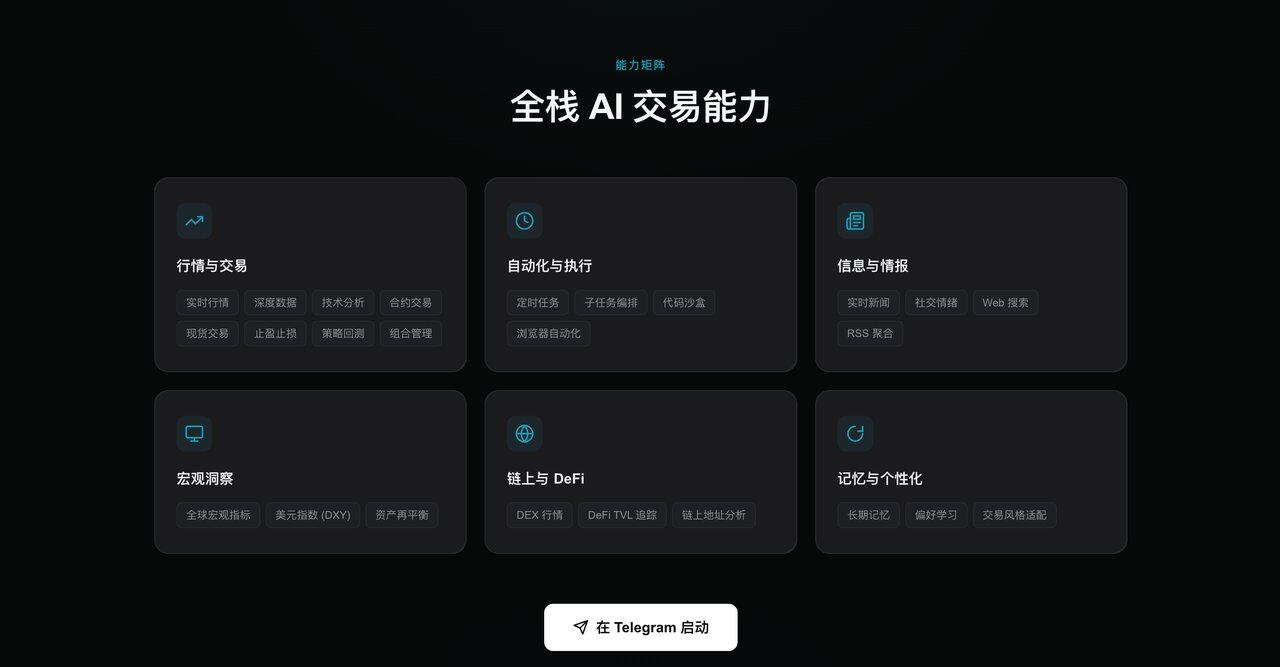 GetClaw是Bitget推出的全球首个开箱即用AI交易自主智能体。用户无需安装任何软件,在Telegram中直接对话即可使用。它具备实时行情、技术分析、信息检索、代码执行、定时任务等45项能力,覆盖行情监控、策略分析、市场情报、自动化任务等多个交易场景。