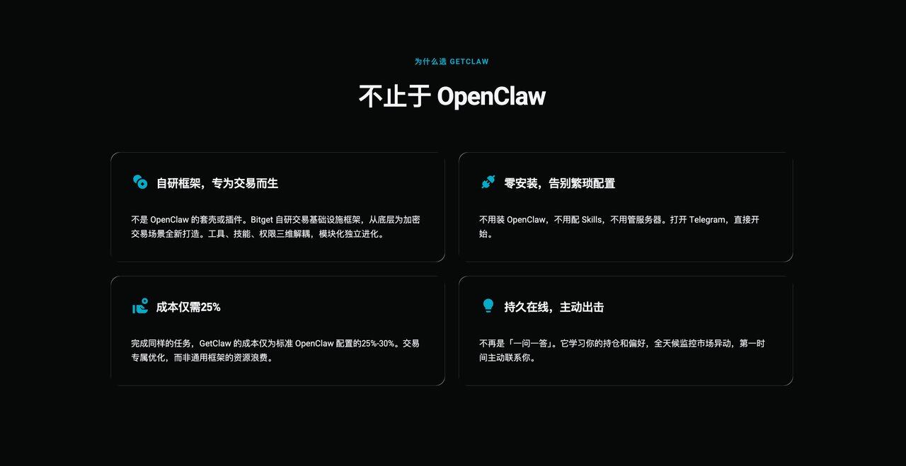 GetClaw并不是OpenClaw的简单封装或插件,而是Bitget为交易场景重新构建的AI交易智能体,从底层架构到安全机制,GetClaw都围绕效率、成本与安全性进行设计。