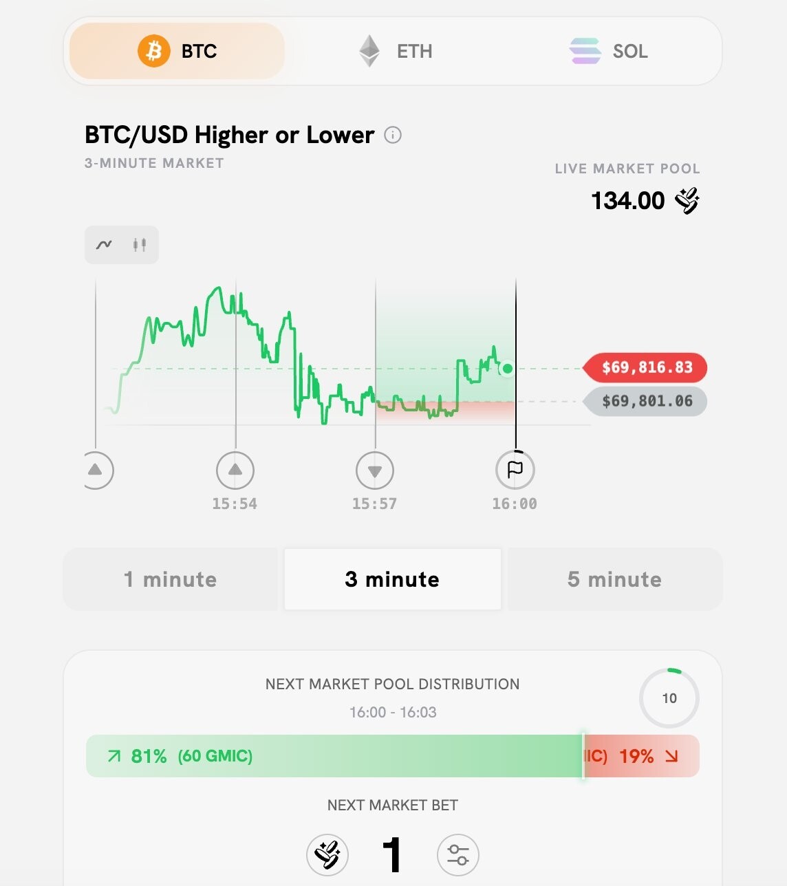 STEP 3. 进入 Linera 预测市场板块(链接:https://linera.market/?market=BTC),免费领取 GMIC 游戏币,可以在 BTC、SOL、ETH 三个预测市场中进行体验。