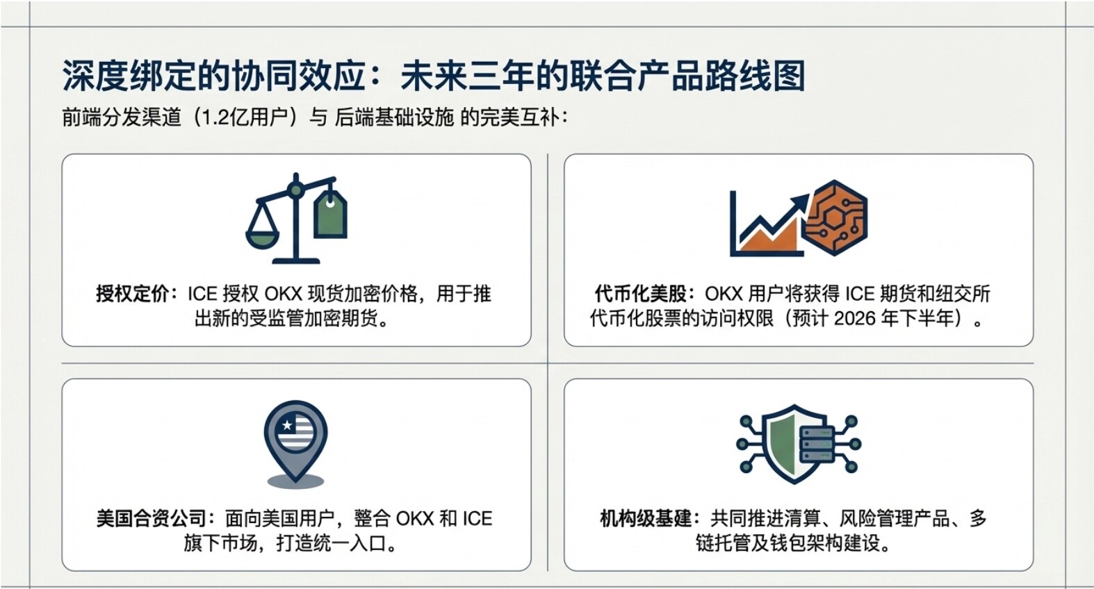 在供给侧,纽交所正在推进支持即时交割(DVP)与 7×24 小时流转的代币化证券引擎;在清算侧,ICE 试图通过建立代币化存款(Tokenized Deposits)机制,消除法币与数字资产的跨链结算摩擦;而在分发侧,OKX 沉淀的上亿级原生加密账户体系,补齐了其面向全球零售终端的流动性出口。
