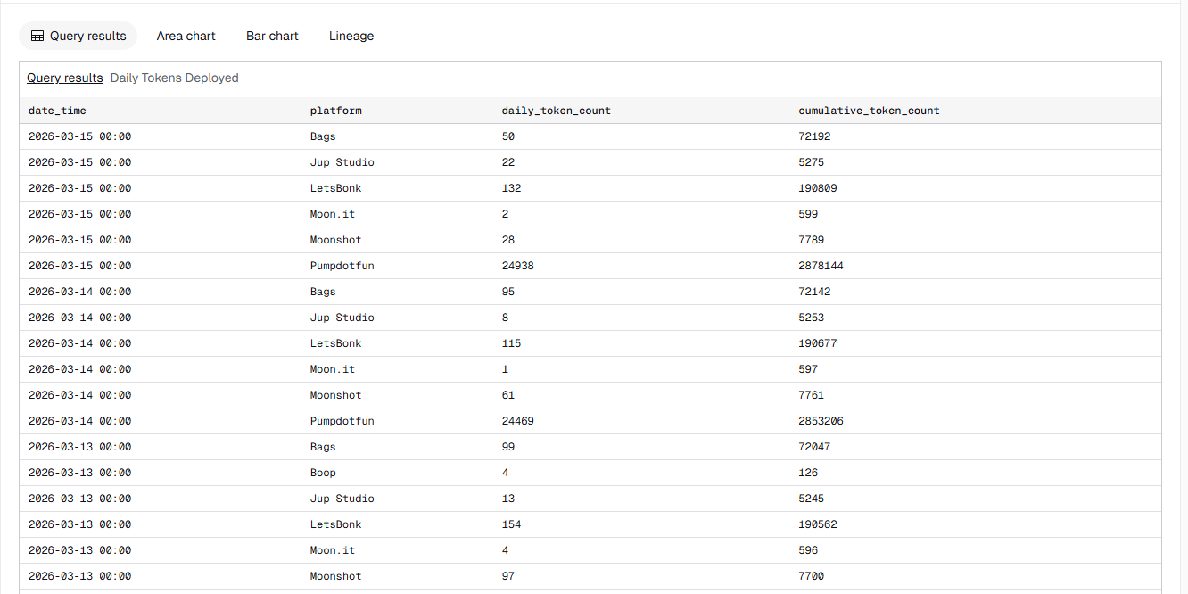 从市场格局上来看,Pump.fun在Solana生态的统治地位进一步得到了加强。以3月15日的数据为例,Pump.fun代币创建数量占比达到了99.1%,毕业代币比例为94.8,单日的交易量占比约为93%。当天,Pump.fun发币24938个,而LetsBonk只有132个,Bags为50个,Moonshot为28个,其他的代币发射平每日的数据量已经完全无法和Pump.fun进行竞争。