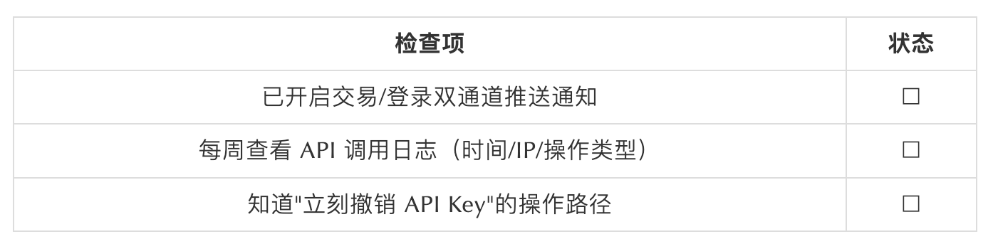 - 每 90 天轮换一次 API Key,旧 Key 立即删除