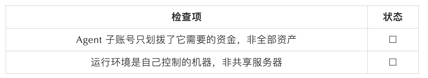 - 主账号只划拨 Agent 实际需要的资金,不是全部资产