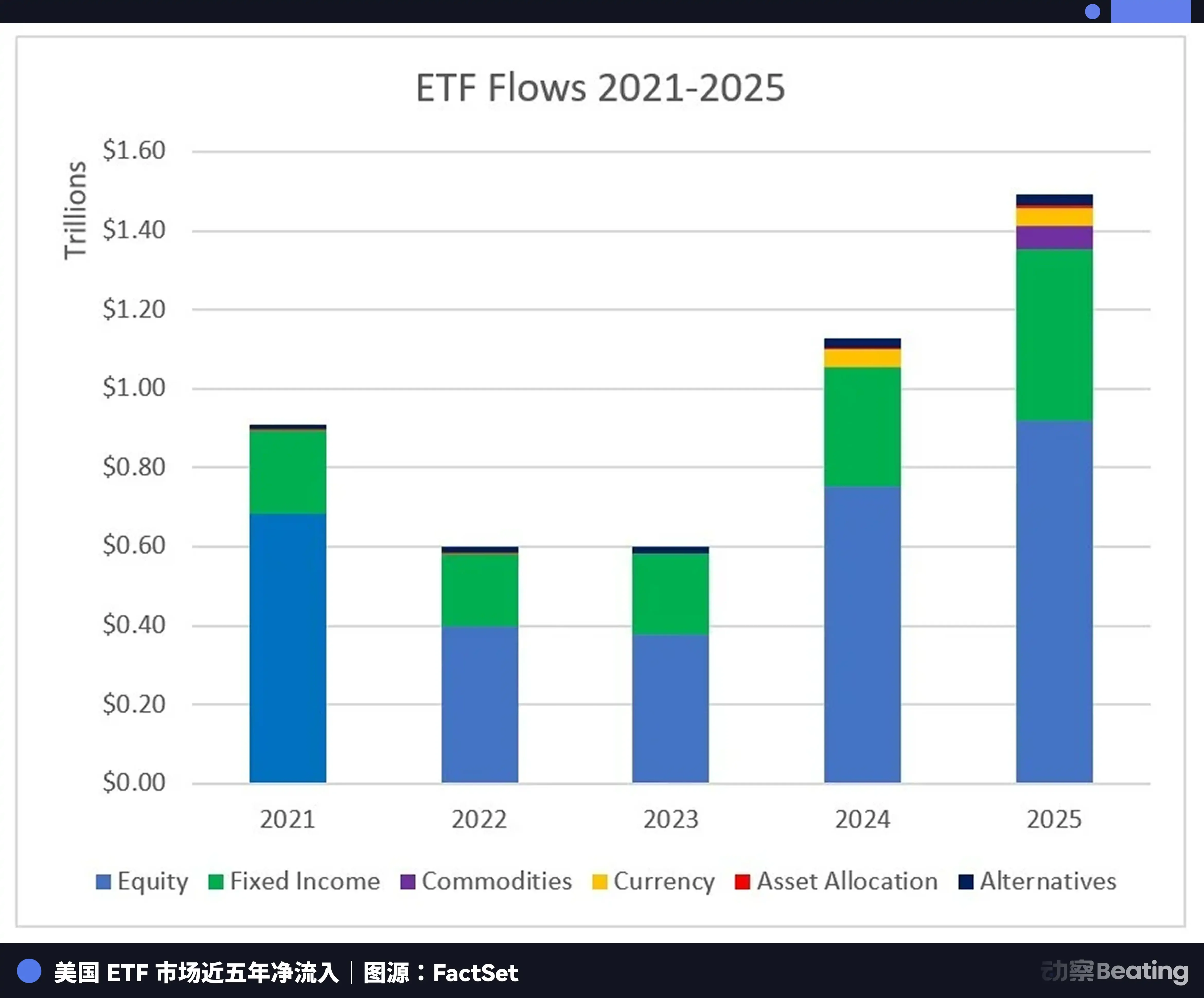 截至 2025 年 3 月,美国被动基金(含共同基金和 ETF)管理资产规模达到 15.96 万亿美元,占全部共同基金行业资产的 51%,首次超过主动管理基金。2025 年全年,美国 ETF 市场净流入 1.49 万亿美元,创历史纪录,其中权益类 ETF 吸纳了 9230 亿美元。