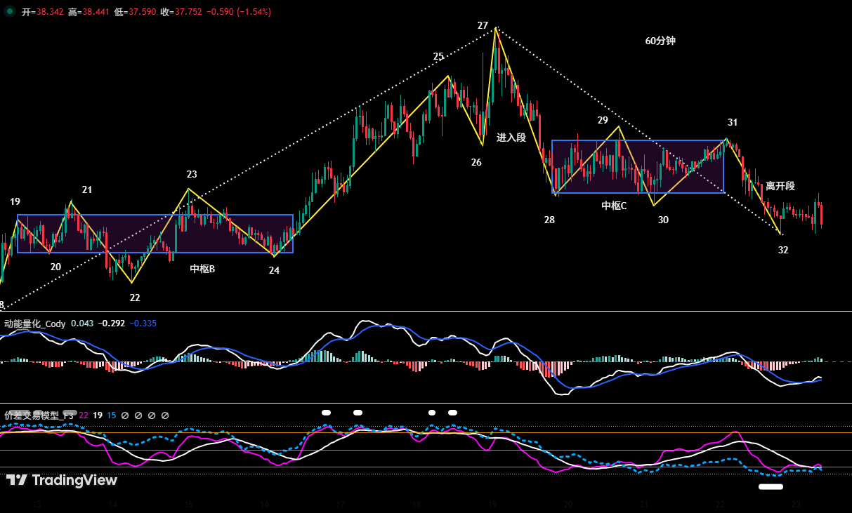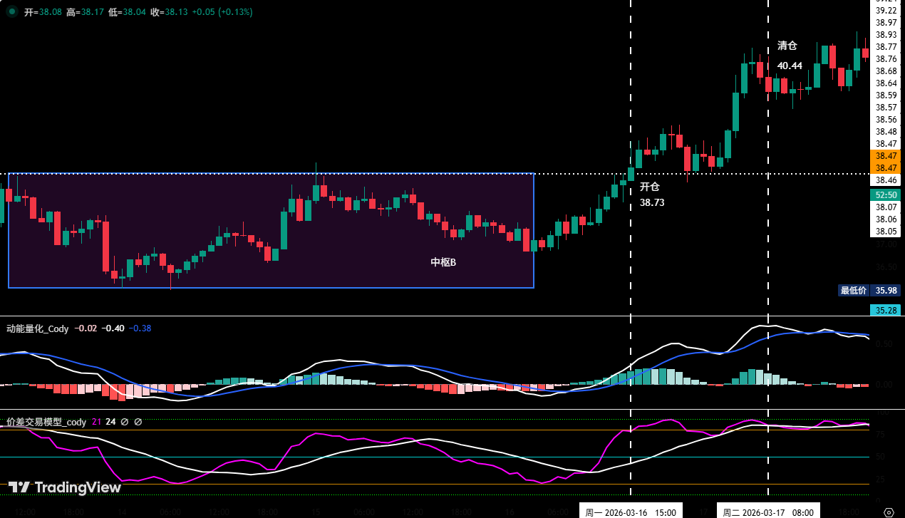 • 开仓决策:本次开仓决策基于对上涨中枢 B 构建完成后趋势延续的预判。具体触发信号为价格有效突破中枢上轨阻力(约 38.54 美元),且价差与动能两大量化模型发出看涨共振信号,多重依据叠加显著提升了入场时机的可靠性。据此,我们于 38.73 美元执行了 30%仓位的多单开仓。