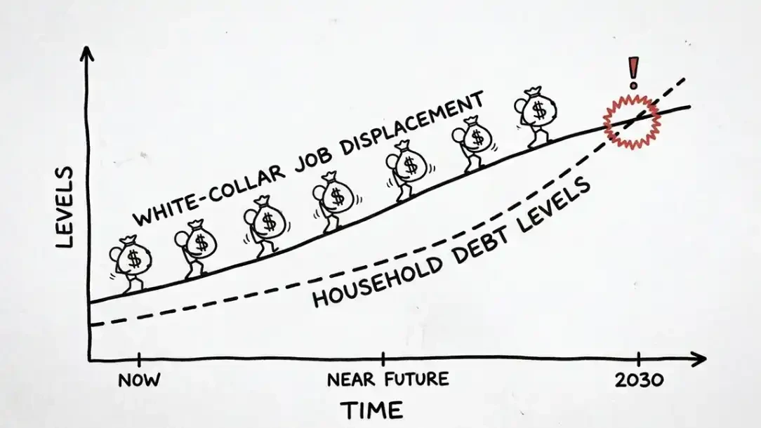 我们正身处一个以债务为基础的经济体系中。在一个高杠杆经济里,大规模的「通缩型生产力提升」并不会带来繁荣,而是可能直接引爆整个系统。白领群体普遍背负着房贷、车贷以及无法免除的学生贷款。AI 并不需要替代所有工作,就足以引发危机,哪怕只是小比例的岗位被取代,也会引发连锁反应,最终演变为银行体系层面的系统性违约。