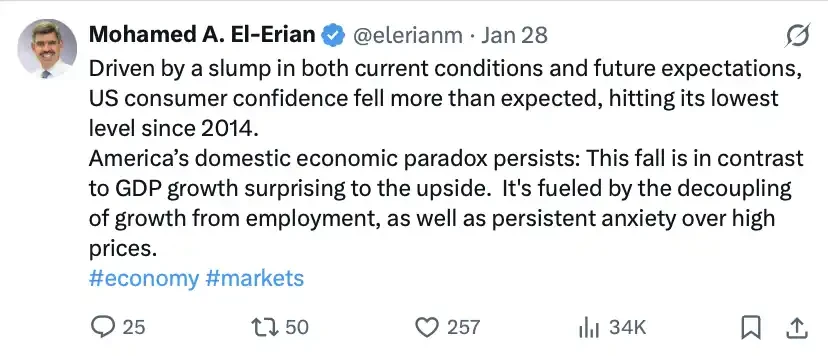这段内容的核心是:美国经济出现「数据与体感背离」的矛盾信号。一方面,消费者信心大幅下滑,已降至 2014 年以来最低水平;另一方面,GDP 增长却超出预期。这种「经济悖论」背后,是增长与就业逐渐脱钩,以及高物价带来的持续焦虑——也就是说,宏观数据看起来还不错,但普通人的实际感受却在变差。