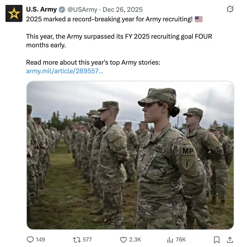 2025 年,美国陆军招募人数创纪录,并且提前 4 个月完成全年目标。在宏观背景下,这通常被解读为:当经济机会减少、就业环境趋紧时,更多人会选择进入军队作为稳定出路
