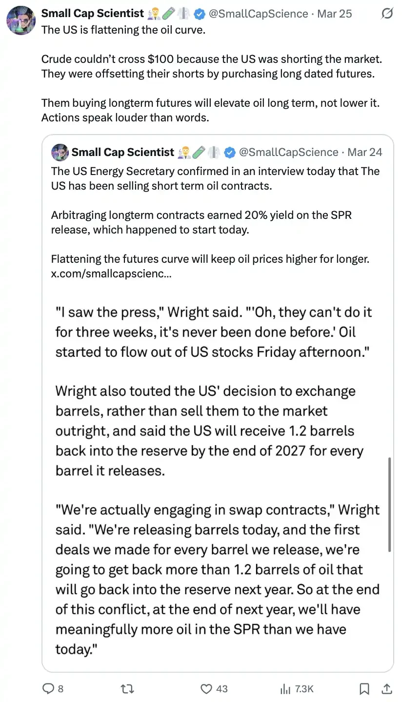 这段内容的核心在于:美国正在通过金融手段「干预」原油市场结构。具体做法是,一边做空短期原油合约压制油价上涨(避免突破 100 美元),一边买入长期期货进行对冲,从而「压平期货曲线」。这种操作在短期内确实能稳定油价,但同时也在抬高长期油价预期。与此同时,美国还配合释放战略石油储备(SPR),并通过长短期合约套利和「交换合约(swap)」的方式,实现放油的同时在未来拿回更多储备(每放 1 桶,未来拿回约 1.2 桶)。整体来看,这是一个「短期控价、长期转移压力」的策略——当下的稳定,可能意味着未来更高的油价。