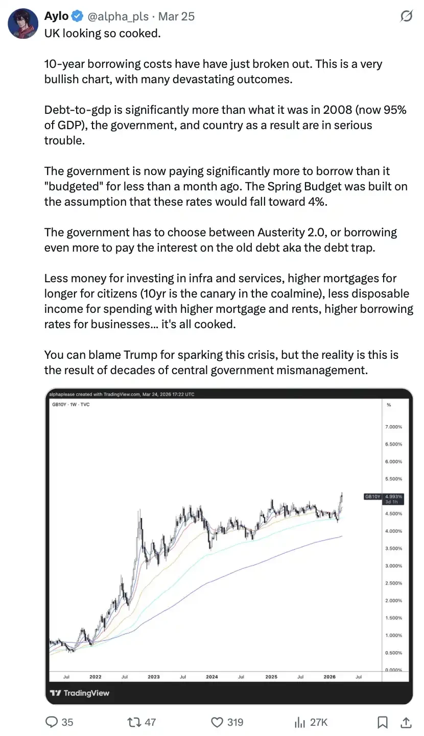 贴文内容:英国现在的状况,可以说已经「彻底糟透了」。10 年期借贷成本刚刚出现明显上行突破。从图表来看,这是一个典型的「看涨利率」的走势,但背后对应的却是一系列潜在的严重后果。当前英国的债务占 GDP 比例已远高于 2008 年(现在约为 95%),无论是政府本身,还是整个国家的财政状况,都已陷入相当严峻的局面。更关键的是,政府现在的借贷成本,已经远远高于不到一个月前预算中设定的水平。当时的春季预算是建立在利率会回落至接近 4% 的假设之上。如今,政府不得不在两种不利选择之间做出取舍:要么重启紧缩政策(Austerity 2.0),要么继续借更多的钱来偿还旧债利息——也就是陷入所谓的「债务陷阱」。结果是:用于基础设施和公共服务的资金减少,居民将更长时间承受高房贷利率(10 年期利率已经成为重要预警信号),在房贷和租金压力上升的情况下,可支配收入进一步下降,企业的融资成本也持续走高……整体局面可以说已经全面恶化。你可以把这场危机归因于特朗普的政策触发,但更现实的情况是:这是中央政府几十年来管理失误累积的结果。
